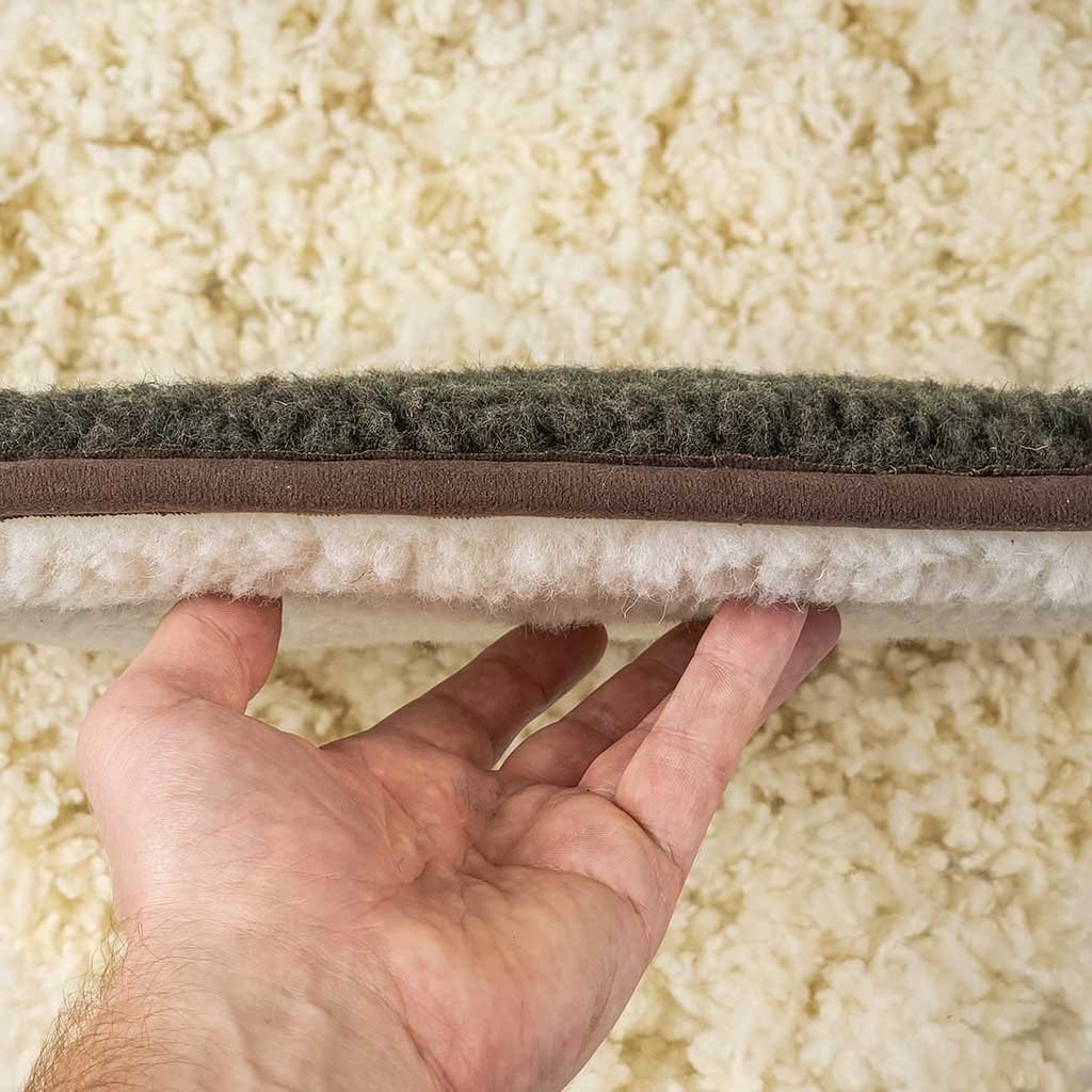 - Vrchná + spodná strana: 100% ovčie rúno „baranček“ (Nový Zéland), cca 580–600 g/m².