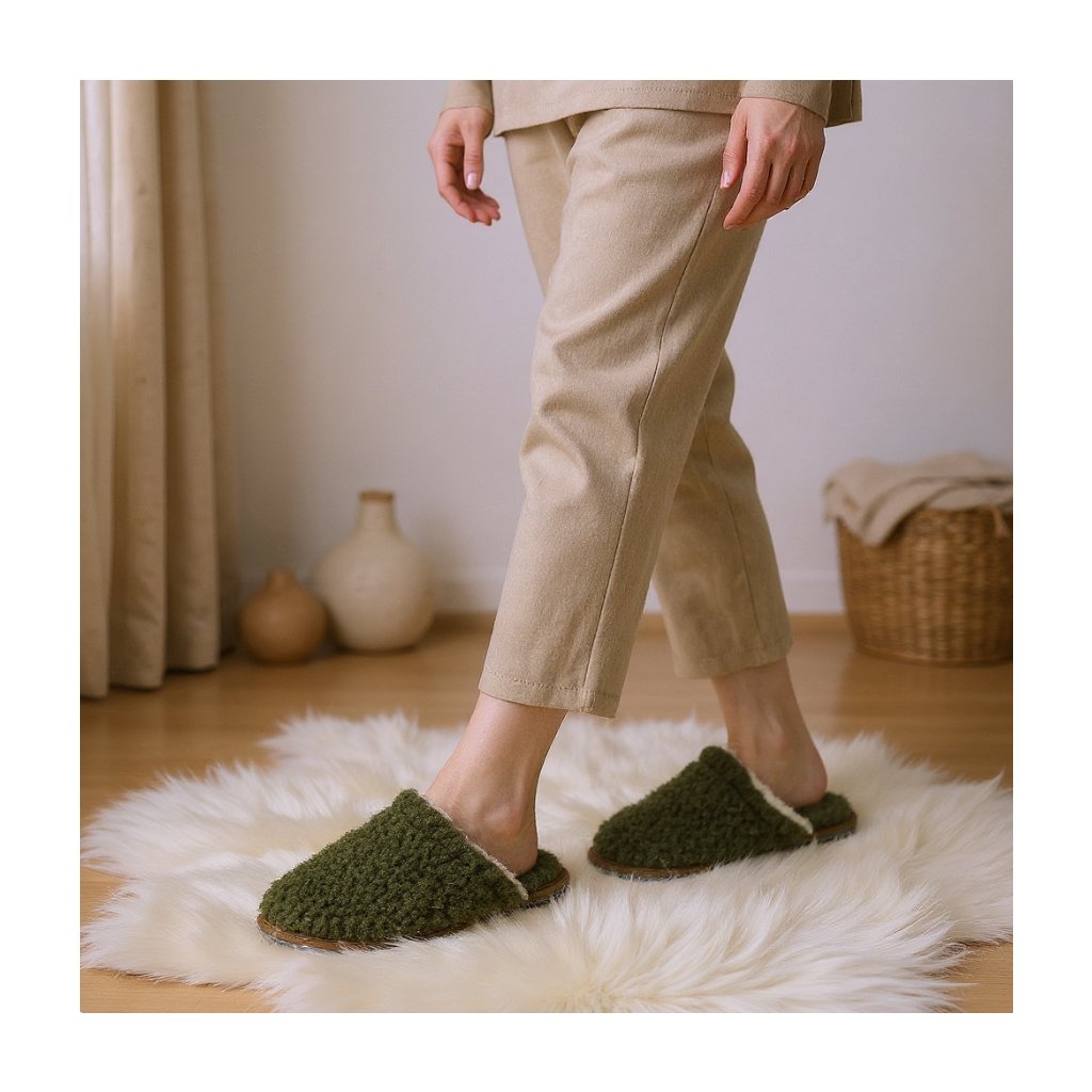 Domáce merino šľapky z jahňacej vlny sú stvorené na bosú nohu, studenú podlahu a dlhé večery doma. Hustá 100 % merino jahňacia vlna 580 g/m² tlmí každý krok, drží teplo, ale nohy v nej „nedusí“. Poľovnícka zelená je decentná, funguje v byte, na chate aj v domčeku na vidieku – jednoducho papuče, ktoré sa nosia každý deň, nie iba cez sviatky.